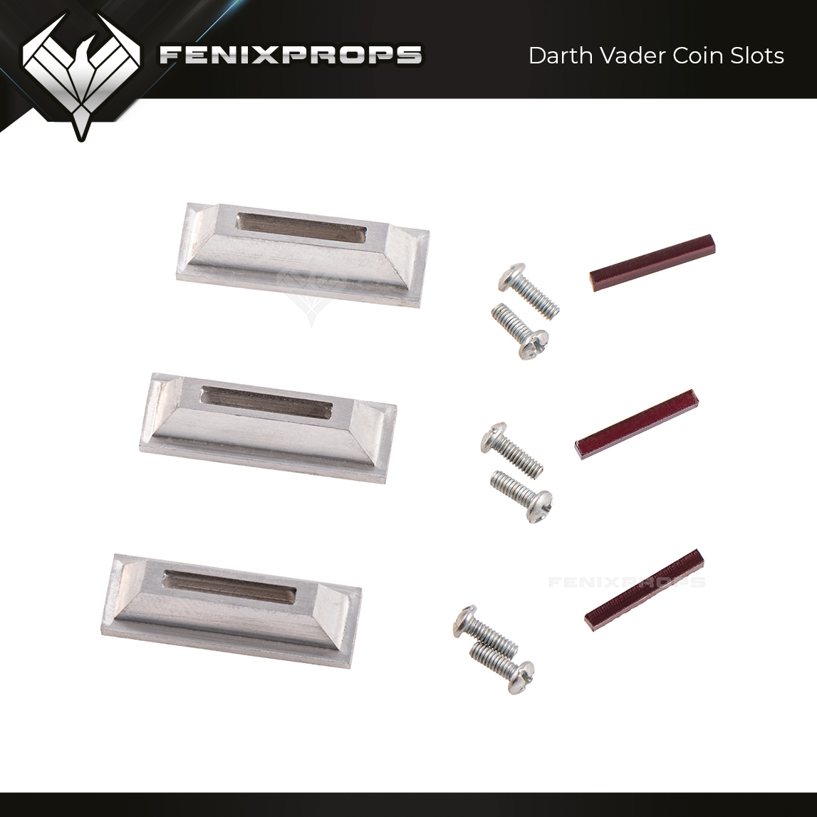 Comes with 3 aluminum coin slots, 6 screws and 3 red acrylic inserts.