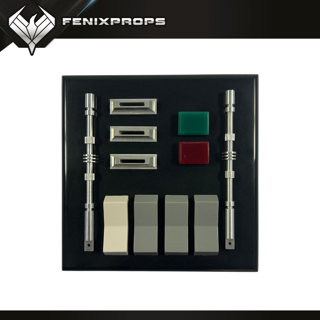 Green and red colored resin panels that are ready to use, made from resin replicas of the original found parts that were used in the movie.